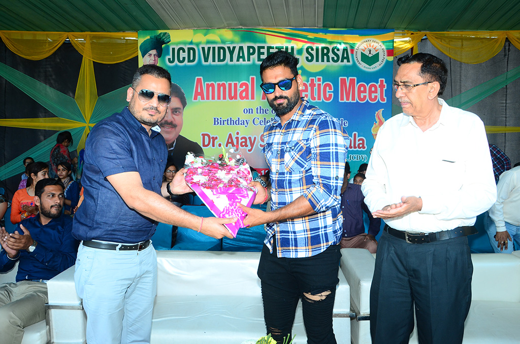 On the occasion of the birth anniversary of Dr. Ajay Singh Chautala at JCD Vidyapeeth, the 2nd day of the 14th Annual Athletic Meet was officially inaugurated by Dr. Dilbag Singh, Chairperson, Computer Science Department, Ch. Devi Lal University, Sirsa who joined as Chief Guest. On the same day, in the evening session, different competitions were organized. Chairperson of the Department of Law of Ch. Devi Lal University Sirsa, Prof. J.S. Jakhar and Prof. Ravinder Pal Singh Ahlawat, attended as special guests. On this occasion, the Chief Guest was Sh. Pradeep Sangwan, noted cricketer who was received by the Management Coordinator Er. Akash Chawla, Director Academics of JCDV, Dr.R.R.Malik, Mr. Siddharth Jhinjha, Management Executive, JCD Dental College and Principals of all constituent colleges of JCDV.