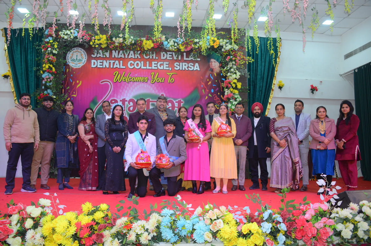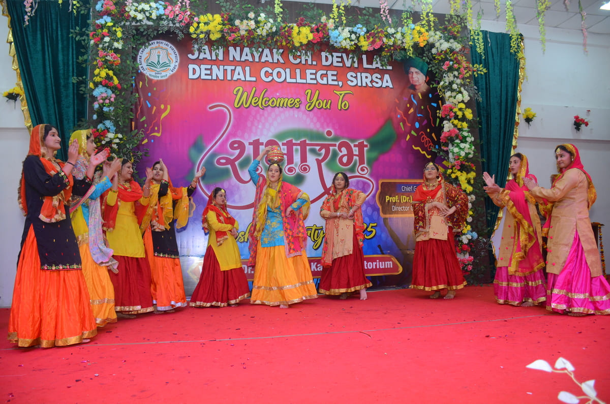 The function commenced with the ceremonial lighting of the lamp, followed by floral tributes to Jan Nayak Chaudhary Devi Lal Ji. A powerful Shakti dance performed by the BDS 2025 batch students set an inspiring tone for the event. This was followed by a warm welcome address by Dr. Arindam Sarkar, Principal, JCD Dental College, Sirsa, who encouraged students to pursue excellence in academics and professional ethics.